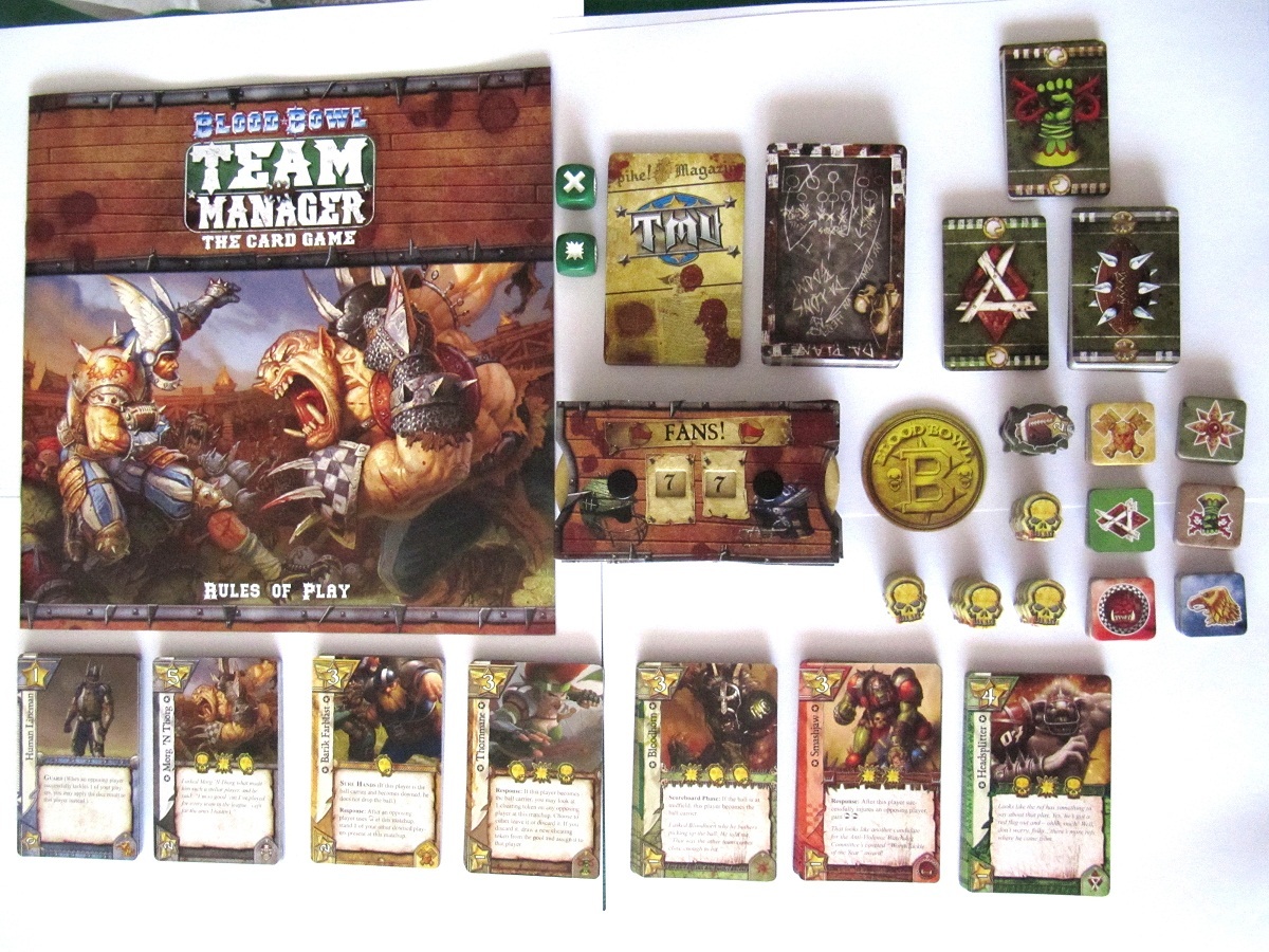 Blood Bowl Team Manager es un juego de cartas no coleccionable de 2 a 4 jugadores, publicado en español por Edge Entertainment, en el que al final de 5 rondas de juego, gana el entrenador que haya conseguido más fans, normalmente por ganar partidos, aunque hay algunos equipos que pueden ganar fans por eliminar jugadores enemigos o por acumulación de mejoras de equipo y diversos asistentes.