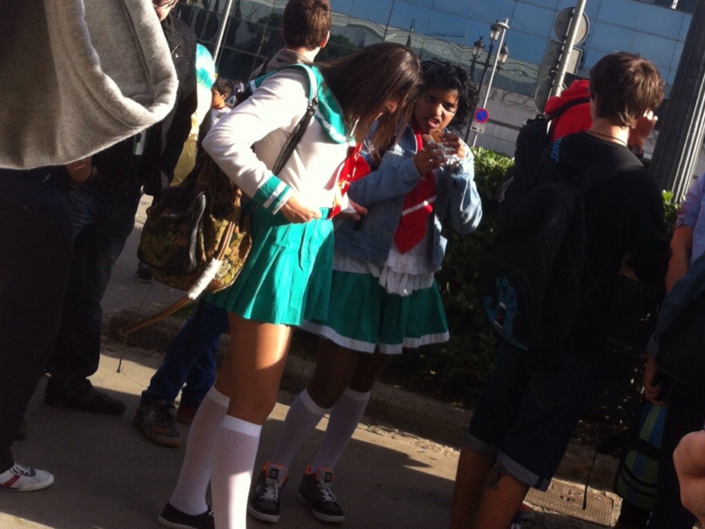 Otra cola igual de larga se manifestaba en la acera de enfrente, para entrar al evento. Y resultó que hacía calor… mucho calor… acostumbrado que cuando se hacía en la Farga, casi siempre había un día de lluvia… la gente disfrazada, dependiendo del disfraz, no debía estarlo pasando bien. Y claro, el viernes, era el día de entrada gratuita para la gente que fuese disfrazada… sin criterio ninguno, podías ir de personaje de manga, ponerte un rombo verde en la cabeza y decir que vas de personaje de los Sims, de Hitler vestido de sirvienta como en la película Little Nicky… Todo vale… Si yo fuese de seguridad a tres cuartas partes de los disfrazados les habría dicho que me enseñasen el manga en el que salen o a pagar los 7 euritos fresquitos que valía la entrada… “¿Disculpa? ¿Ramus del League of Legends? A pasar por caja”.