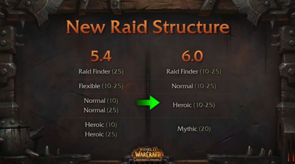 Nuevo modo de raideo, Mítico,que será el más dificil para grupos de 20 personas. Para dificultades menos exigentes, los enemigos escalarán en escalarán en dureza dependiendo del número de jugadores, de 10 a 25, no siendo problema si por ejemplo en un grupo hay 19 jugadores, ya que los jefes serán más faciles que si hubiesen 25 jugadores.