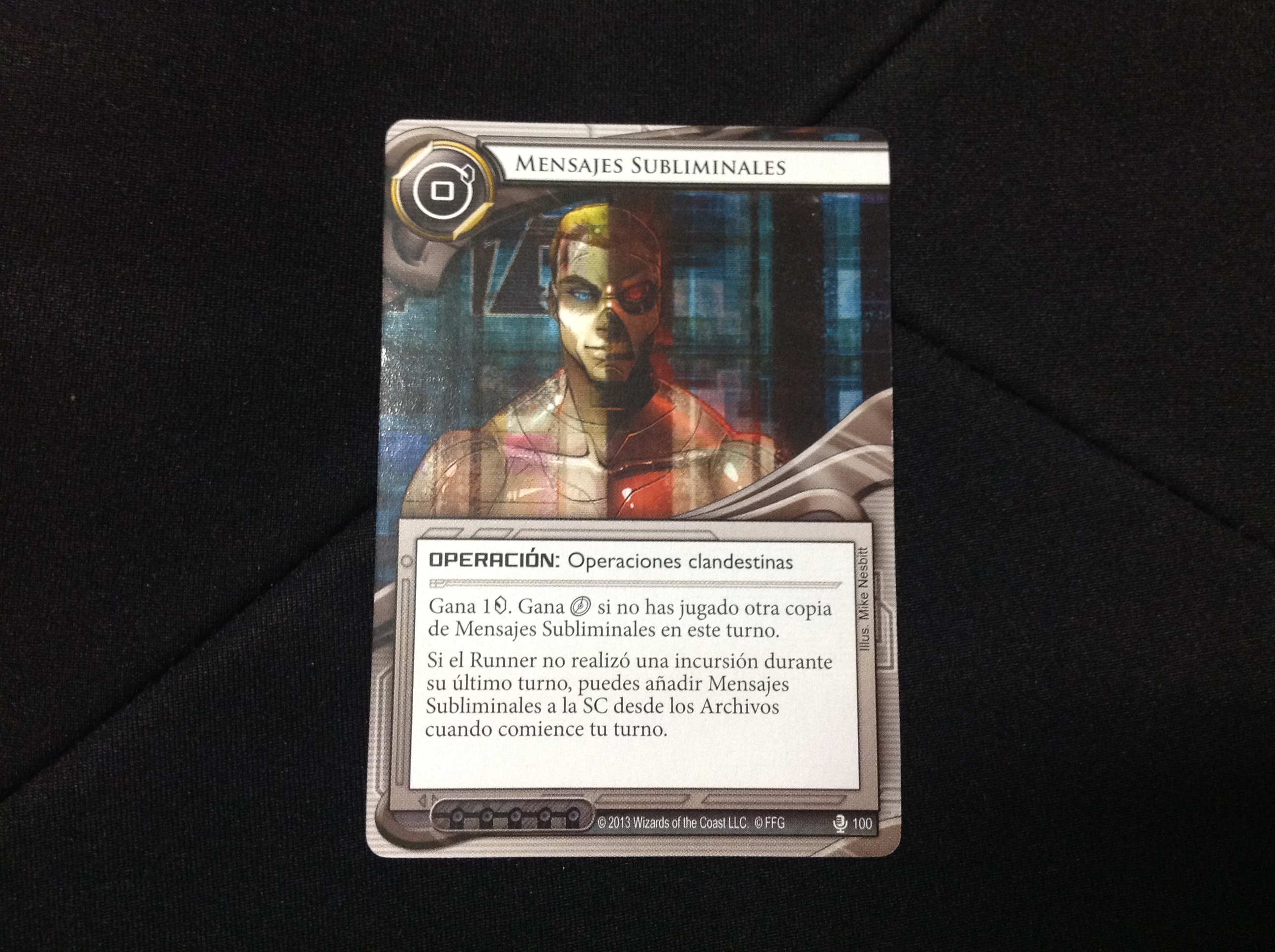 – Mensajes Subliminales: Esta carta no pesa nada en cualquier mazo de Corporación. 1 crédito y un clic la primera que juegues por turno, y si el Runner no ha realizado ninguna incursión en el turno anterior… la puedes devolver a tu mano desde Archivos. Habiendo jugado una, ya estás dandole presión al Runner para que ataque todos los turnos, haciendo que vaya un poco menos preparado si va flojo de créditos, o necesita reponer mano.