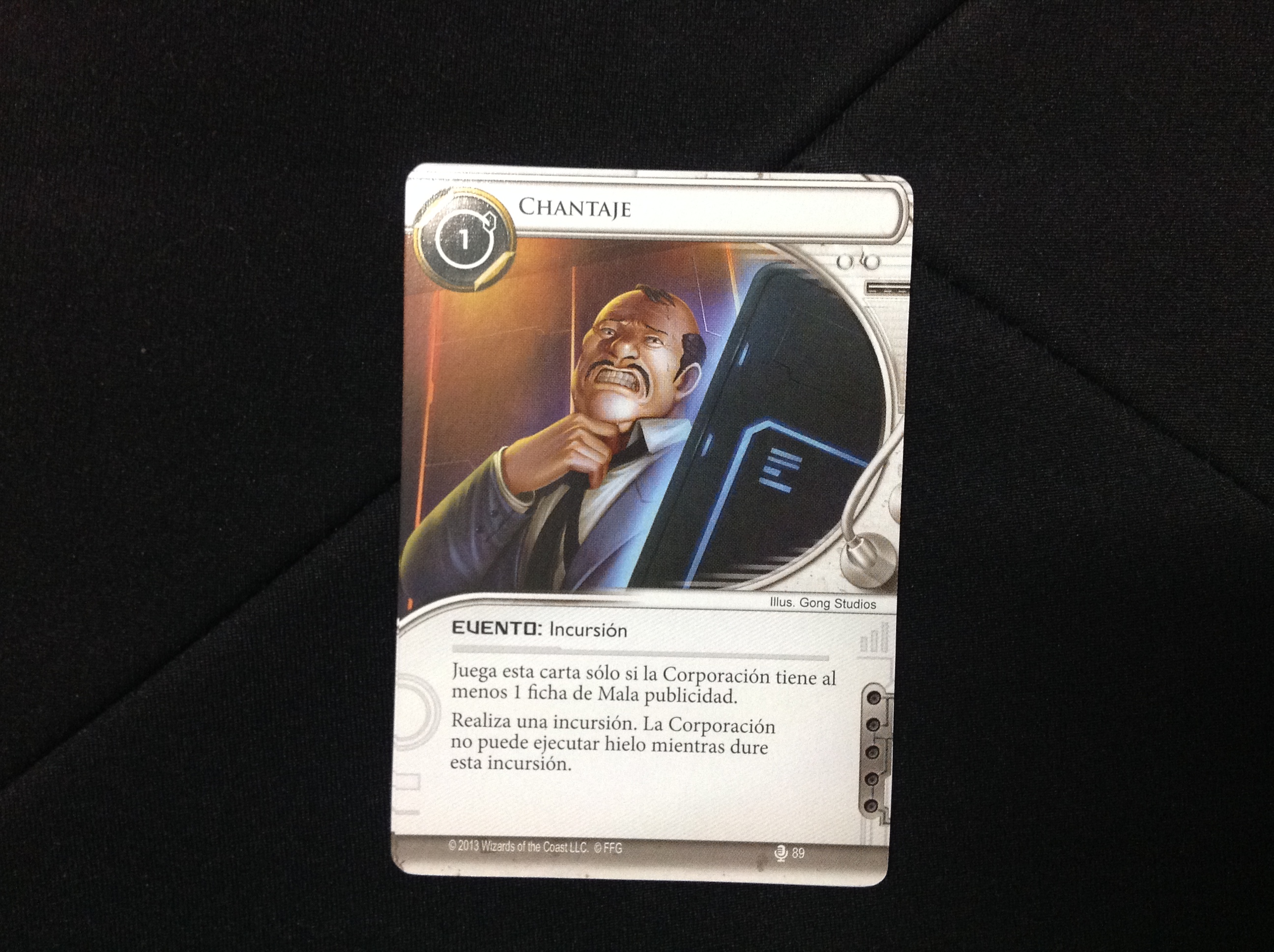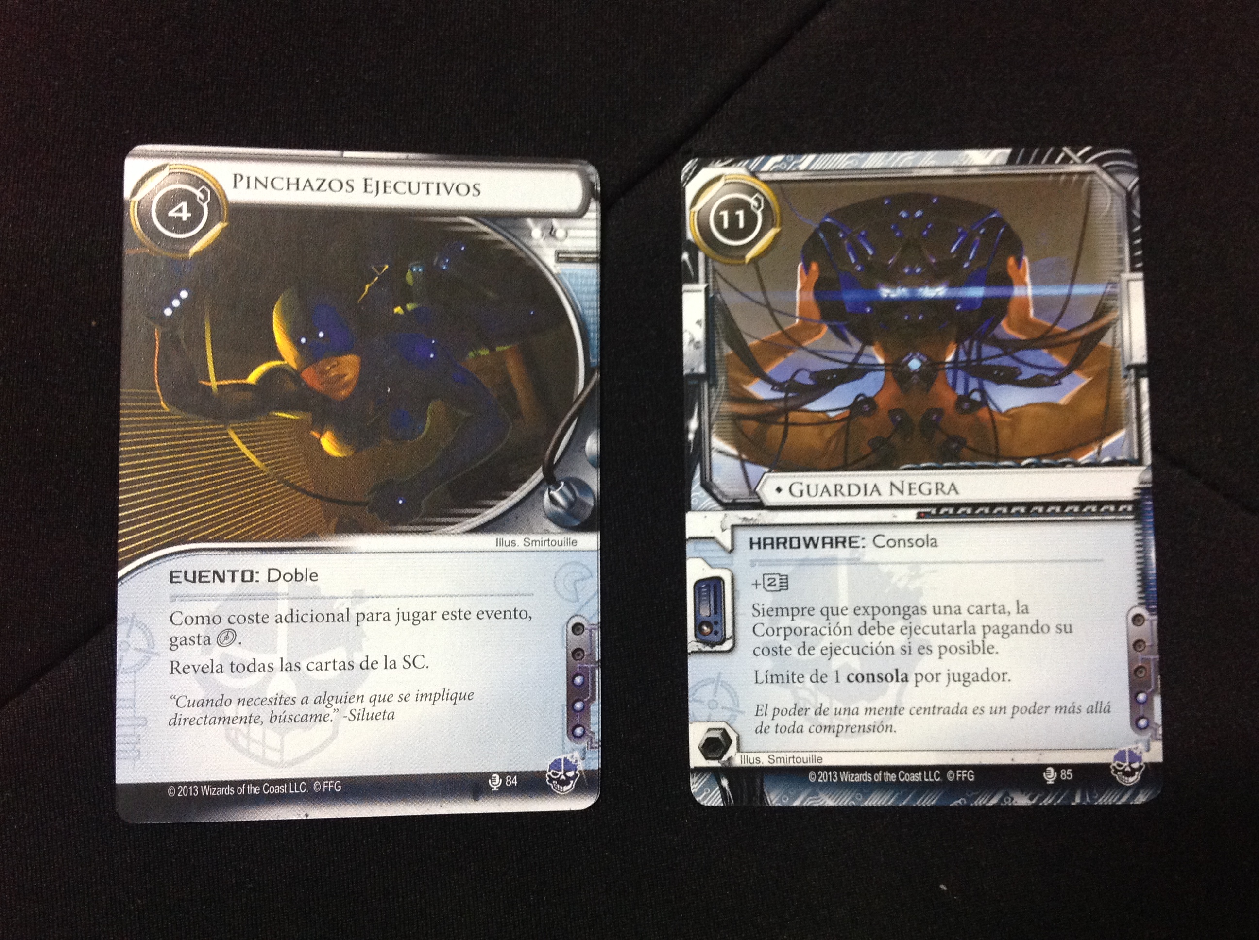 – Guardia Negra: La nueva Consola para Criminales inquietos. Demasiado cara, y si la Corporación no puede pagar el coste de las cartas mostradas… no pasa nada… Se usará para agotar el dinero disponible de la Corporación y luego poder entrar con más comodidas a servidores con hielos boca abajo. Al menos tiene un buen dibujo.
