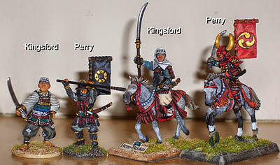 Si no nos han gustado las miniaturas de North Star o si queremos ver otras opciones tenemos las de Perry Miniatures. Los hermanos Perry tienen una gran gama de todo tipo de miniaturas históricas y suelen tener bastante variedad en su gama. Hechas en metal de 28mm y con una calidad también bastante aceptable son seguramente una de las mejores opciones para una banda de Ronin. Prácticamente cualquier variedad en las figuras la encontraremos en Perry; Samurais, Shoei, Campesinos, Ashigarus, Ikko-Ikki, Ninjas y con bastante variedad en su armamento. Otra cosa que ofrece Perry son miniaturas montadas a caballo que en North Star no tenemos aunque Ronin si que tiene reglas para incluirlas. Otro punto a su favor son que tenemos diferentes sets que nos permiten incluir determinados personajes históricos del periodo y que pueden resultar curiosos aunque a nivel de juego no tengan demasiada relevancia. Pero ¿qué tiene Perry de malo? Pues que al no estar pensadas en exclusiva para Ronin nos encontramos con que si simplemente necesitamos un par de miniaturas con una determinada equipación estos no los podemos comprar por separados si no que nos vienen en packs de 5 o 6 por un precio de unas 7-8 libras lo que puede subir el coste de la banda si nos decidimos por esta opción ya que acabaremos comprando figuras que seguramente no terminaremos necesitando. Además aunque no lo he visto personal un amigo me contó que las miniaturas aunque son 28mm serían algo más finas de lo normal, pero no lo he podido comprobar.