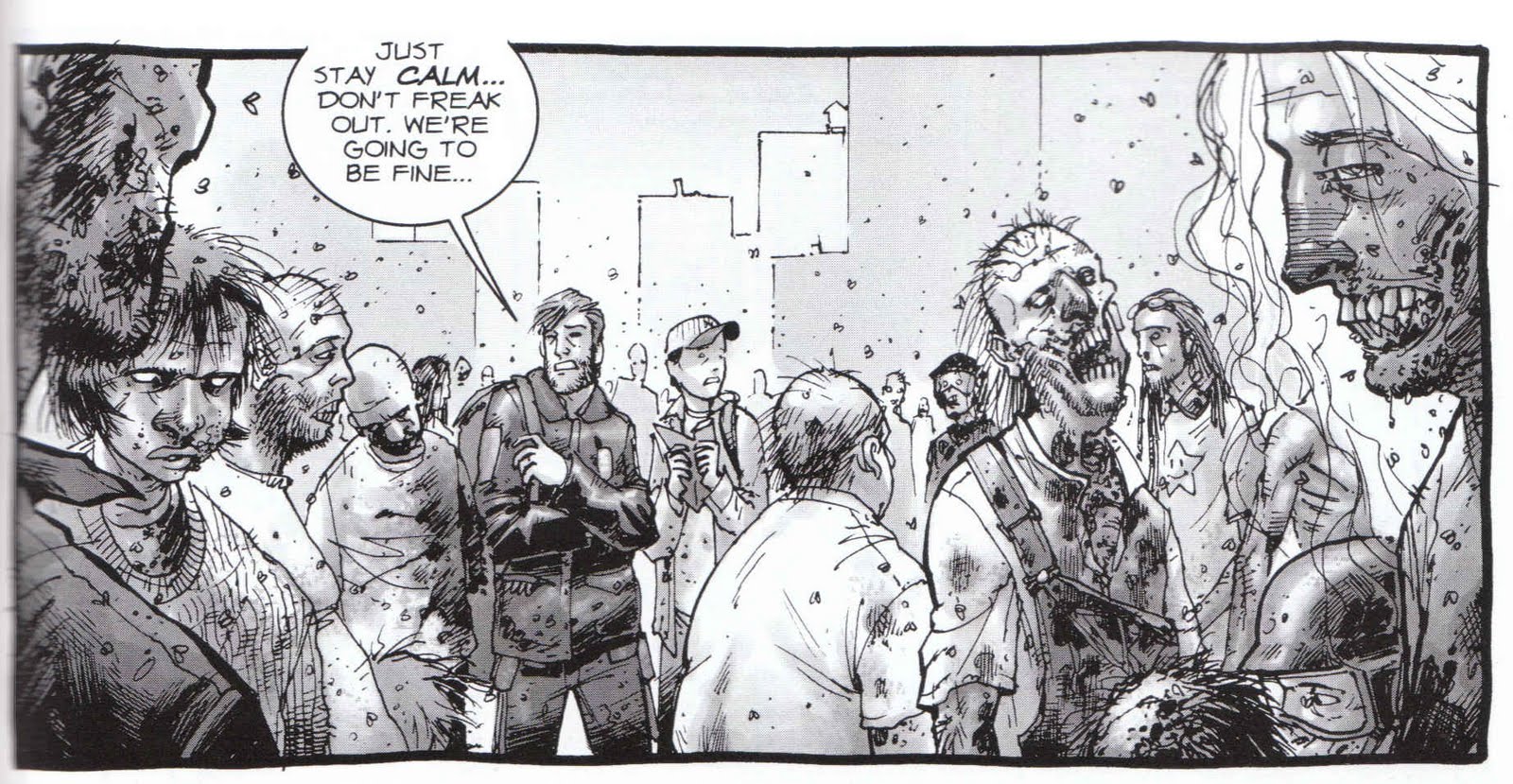 The Walking Dead (Guión de Robert Kirkman, dibujo de Tony Moore #1-#6 y Charlie Adlard #7 en adelante): Publicada originalmente por Image Comics desde octubre del 2003 y editada en nuestro país por Planeta DeAgostini, relata la vida y supervivencia de Rick Grimes y sus compañeros supervivientes en un mundo asolado por los zombis, en el que se desconoce el origen concreto de la plaga, y en el que muchas veces, se ve que el mayor mal al que se enfrenta el ser humano, es él mismo. Tiene como curiosidad que no es necesario ser mordido o atacado por un zombi para convertirse en uno de ellos, si no que al morir de cualquier forma, mientras la cabeza esté intacta, uno termina convirtiéndose, lo que hace suponer una causa ambiental a la plaga.