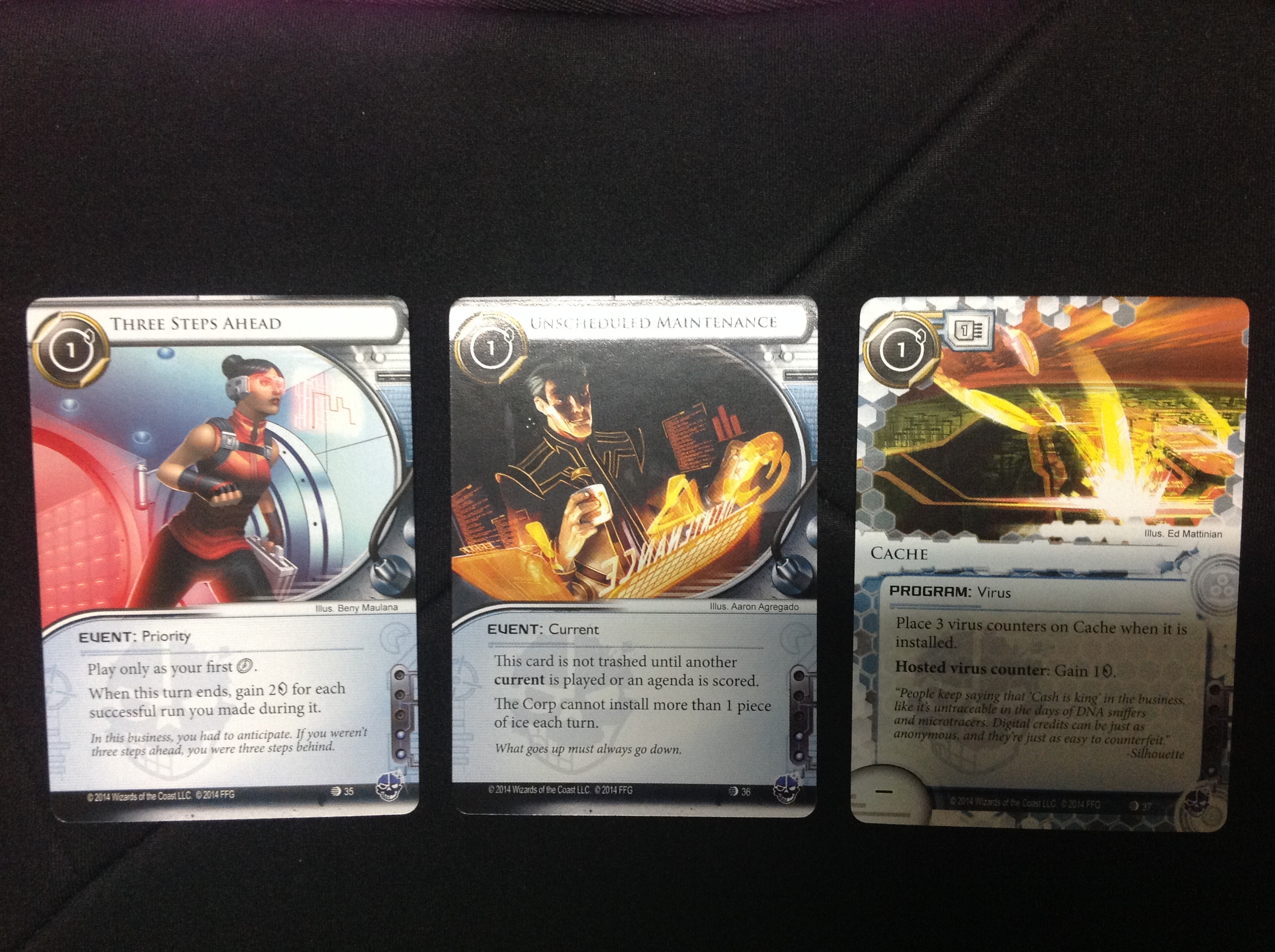 Three Steps Ahead: En un turno en el que tengas planeado hacer varias incursiones, por ejemplo a Archivos para cargar un Datasucker, o si tiene poco protegido I+D y tienes Medium o R&D Interface (igual para HQ con sus respectivas cartas), o teniendo Doppleganger en la mesa, al final del turno ganarás 2 créditos por cada incursión con éxito realizada.