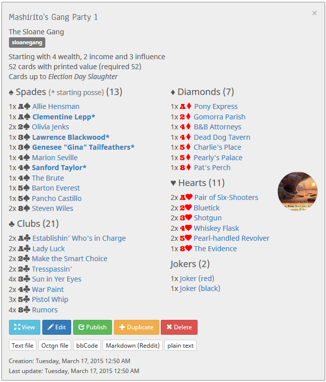 Viendo que su táctica era de abusar de la habilidad de su Outfit bajándo gratis cualquier Deed, dado que lo usaba junto a la señora Lillian Morgan, que tiene una influencia de 5, me dije a mi mismo que la única manera de tener posibilidades era cazarla en cuanto saliese de casa. Así que cambié mi banda inicial para tener 4 puntos de influencia en vez de los 3 con los que estaba empezando hasta ese momento, por si mi plan no funcionaba que le fuese un poco más difícil ganarme. Pero tuve todo a mi favor, y en las dos partidas mi plan funcionó, pudiendo bajar a Steven Wiles, poniendole a mi otro stud +2 balas con War Paint, y atacando sin miramientos a Lillian, ya que si no le salía algo para marcharse a casa, en el duelo que yo le cascaba robaba entre 10-12 cartas y a pokers y un reponer, pude eliminarla en primer turno las dos partidas, pudiendo ganar sin problemas, y alzándome con la victoria en el torneo…