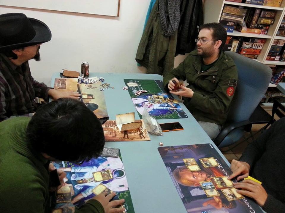 Pues va a ser que no… Vigilando los movimientos de los demás, cada uno de los pistoleros presentes, ponemos a parte el revolver, y del saloon cercano sacan unas mesas y unas sillas, en las que tras un sorteo realizado por el Alguacil Kalamar, cada participante se sienta delante de su rival para enfrentarse en un duelo a muerte… con las cartas de Doomtown: Reloaded!.