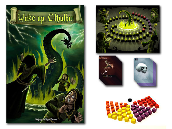 ¿Y de qué va el juego? Pues resulta que un grupo de sectarios (los jugadores, de 2 a 4, con una versión en solitario, que se desbloqueó durante la campaña de mecenazgo), se han enterado del pronto despertar de nuestro primigenio favorito, el Gran Cthulhu (Iä Iä), y han decidido, cada uno por su cuenta, que no quieren ser devorados! Así que se enfrascan en una lucha de conjuros para ver quien será su lugarteniente tras el despertar de su sueño milenario.