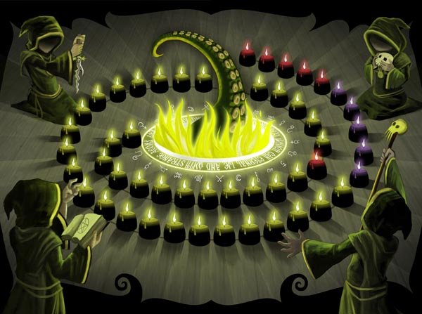 Cada jugador tendrá una serie de cartas (ingredientes), que utilizará para lanzar los conjuros del grimorio o avanzar en su conocimiento arcano para acercarse a su señor, que cada turno irá despertando un poquito y avanzando su ficha hasta lo inevitable. Siempre que avance en su conocimiento arcano, ya sea por la acción de avanzar, o por que un conjuro al ser lanzado lo permita, el jugador puede seguir haciendo acciones, por lo que el juego es una constante búsqueda del combo para poder jugar más y más cartas y poner más fichas propias en el tablero, ya que gana el que cuando despierte Cthulhu, tenga más fichas en mesa.