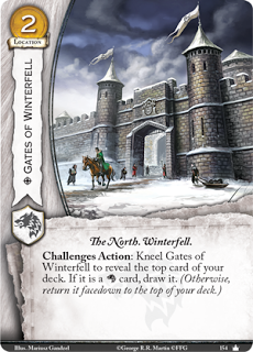 Acción retos: Arrodilla las puertas de Invernalia para revelar la carta superior de tu mazo. Si es una carta Stark, robala. (De otra manera, devuelvela boca abajo a la parte superior de tu mazo).