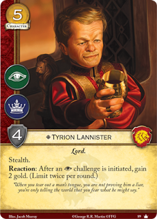 Tyrion tiene muy buenos números sumado a que tiene sigilo, palabra clave siempre útil para ganar retos. Su habilidad nos da 2 monedas cada vez que alguien inicia un reto, lo que nos vendrá muy bien para pagar cartas con emboscada (que para la casa Lannister hay bastantes) o eventos. Me parece de los mejores, no tiene ningún tipo de pega para usar su habilidad y dinero gratis no está nada mal.