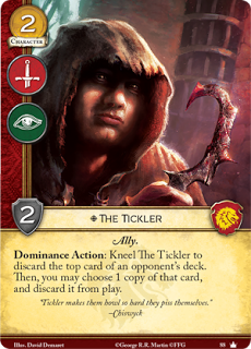 Curioso el cosquillas, girando en dominación reducimos el mazo del otro jugador en 1 carta (una chorrada), pero si esa carta está en juego…. pium descartada. Es un poco lotería, si tenemos la suerte de que la carta esté jugada, sea lugar, accesorio o un personaje, nos la cargamos de gratis. Ahora, con cierta canción que veremos en el spoiler Tyrell… la lotería ya no es tan loteria (música de suspense). A mi parecer es una carta buena solo por los números, y su habilidad es un poco anecdótica.