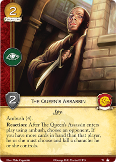 Reacción: Después de que el asesino de la reina entre en juego usando emboscada, elige a un oponente. Si tienes más cartas en mano que ese jugador, el o ella deben matar a un personaje que controle.