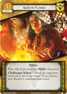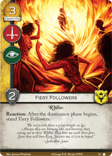 Reacción: Después de que reclutes o juegues una carta R’hllor, elige y arrodilla a un personaje (Limitada una vez por ronda)