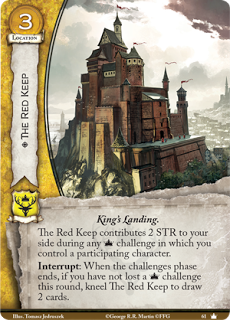 Interrupción: Cuando termine la fase de retos, si no has perdido un reto de poder esta ronda, arrodilla la Fortaleza Roja para robar 2 cartas.