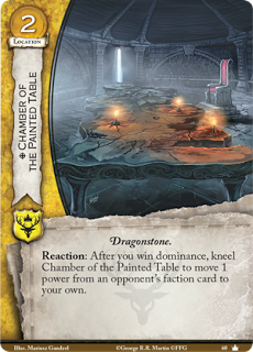 Reacción: Después de que ganes la Dominación, arrodilla la Cámara de la mesa pintada para mover 1 punto de poder de la carta de facción del oponente a la tuya.