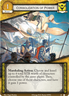 Me he enamorado de esta carta. Es una combinación de Hostigar las tierras de los ríos con Te has equivocado de enano . Es de esas cartas que te pueden servir para ganar la partida arrodillando tus propios personajes para que clamen poder, o hacerle un agujero en las defensas del otro jugador y entrarle hasta la cocina. Solo puede con hasta 4 de fuerza, lo que te deja en 1-3 personajes pequeños o uno solo de los personajes importantes, sin llegar a girar los grandes personajes de casa como Eddard, Tywin o Robert, pero cuando digo solo, lo digo con un tono de menos mal, esta carta es muy buena.