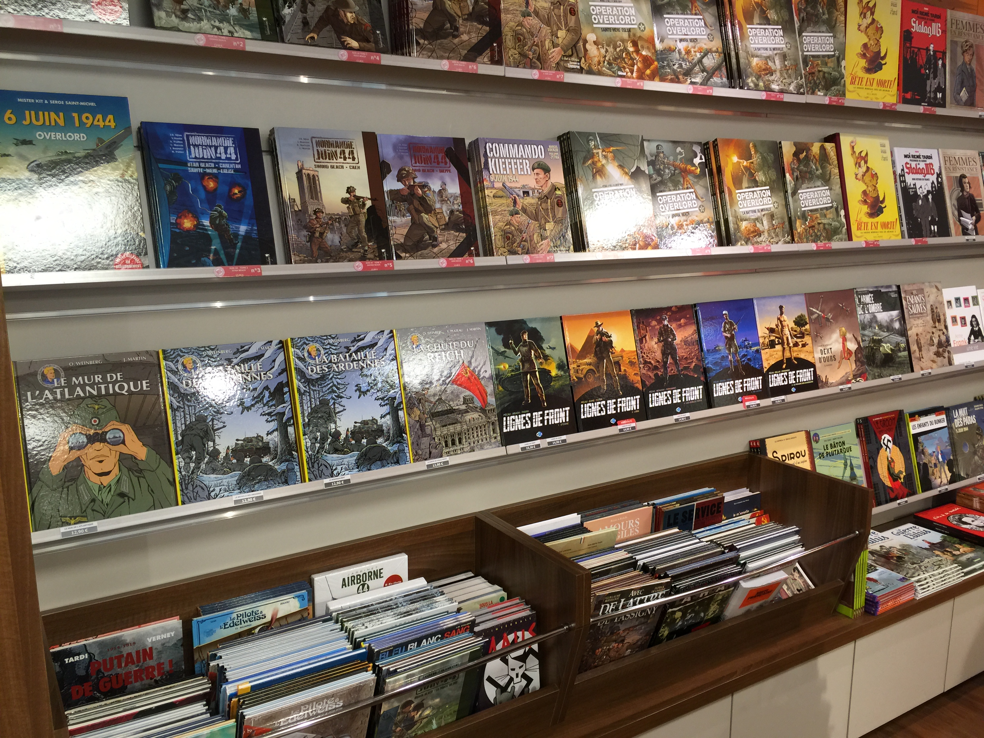Como veis en el lineal, del Memorial de Caen, de encima de estas lineas la BD tiene numerosas obras sobre el desembarco. A la hora de decidir traerme algún cómic a casa sobre el desembarco acabé con dos opciones, una serie de cinco volúmenes con textos explicativos en ingles y el volumen del que os hablo en castellano. Al final la balanza se decantó por la segunda opción por ser más económica, no hubiera podido comprar solo uno de los tomos, y por estar en castellano con lo que mi novia podría leerlo. CRASO ERROR al empezar con la lectura me dio la impresión de estar leyendo una traducción hecha con el Google Translate, algo muy chapucero.