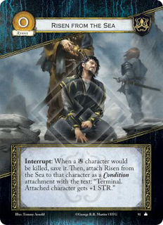 Interrupción: Cuando un personaje Greyjoy vaya a morir, sálvalo. Luego, vincula Alzados desde el mar a ese personaje como un accesorio Condición con el texto: “Terminal. El personaje vinculado gana +1 de Fuerza”.