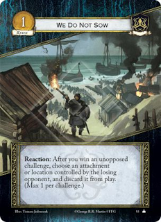 El lema de la casa Greyjoy es un cartonazo. Un extra adicional a ganar sin oposición. Mucho más fácil que jugar un “Put to the torch” que además también afecta a accesorios. Si siempre te guardas 1 moneda, aunque no lo tengas, tu adversario se matará por defenderte, porque si no lo hace puede significar que ese bonito lugar que le está dando cartas cada turno o parte de algún combo macabro se irá al retrete con solo esta carta.