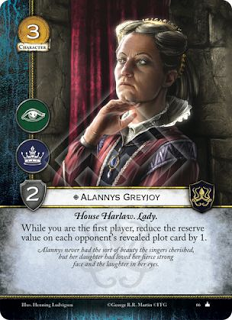 Alannys no es que tenga una habilidad muy buena, en lo que llevo jugado, quitando el primer turno, el valor de reserva no afecta mucho, además de que tienes que ser el primer jugador, hay poco robo así que se suele jugar con pocas cartas en mano, por ahora. Tiene un icono que vas a echar mucho en falta en la caja básica con Greyjoy, intriga, así que compensa.
