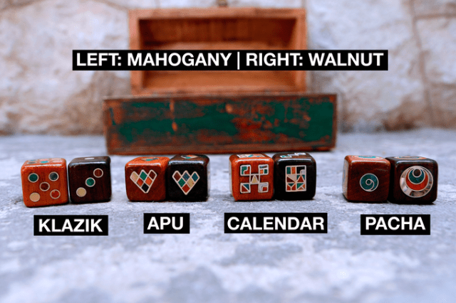 – Se que son caros, pero los Machu Picchu Dice son preciosos dados de madera, metal, conchas y gemas, que valen mucho la pena para los coleccionistas. Dos maderas y cuatro diseños diferentes, hechos a manos en Cuzco, Perú. Temina también el 1 de junio.